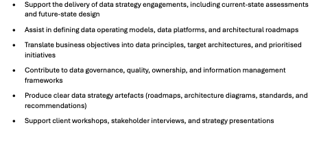 Experience in data architecture, analytics, or data engineering with exposure to data strategy or transformation work.